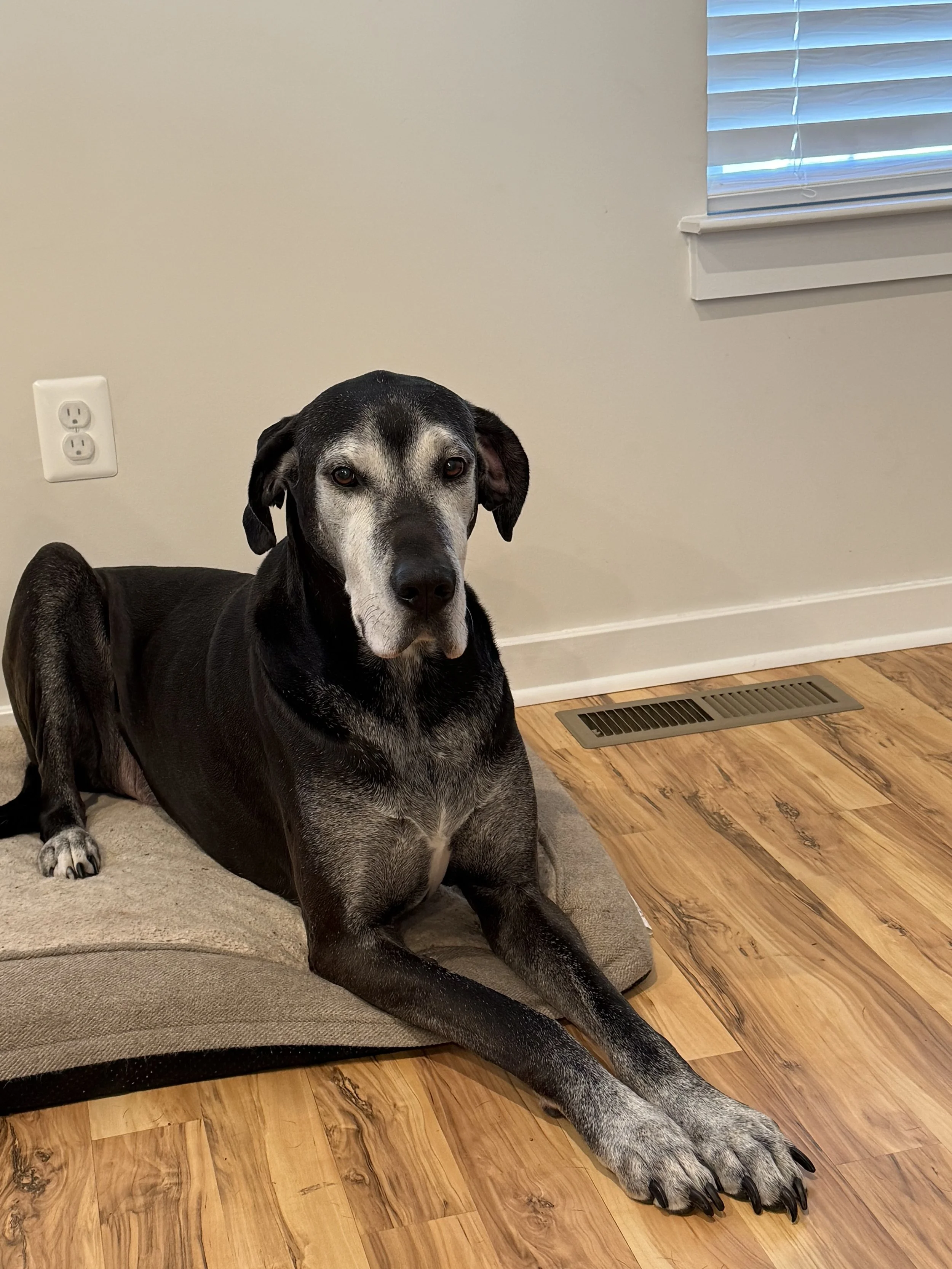 From Tex’s current family: “It is with a heavy heart that we are looking for a new family to love our boy. We’ve been put on orders for Korea and recently found out we’re expecting our third baby. Tex is an 8 and a half year old Great Dane. He has been neutered. He loves lounging around the house and has a playful side still but he pitters out pretty quick. He’s lived with another dog his whole life but isn’t great with other dogs. He’s never been around a cat but lived with a bird who roamed the house often for 7 years that he loved. He is crate trained but hasn’t needed one for a few years now. He’s also house trained and walks well on a leash with a gentle lead. He’d be best in a house with older children only. He is protective of his house and yard but if he sees you let them in then he’s all love and wants pets. He is a sweet old man and doesn’t need a lot of space, just a big comfy bed with a window to look out to spend his days.”